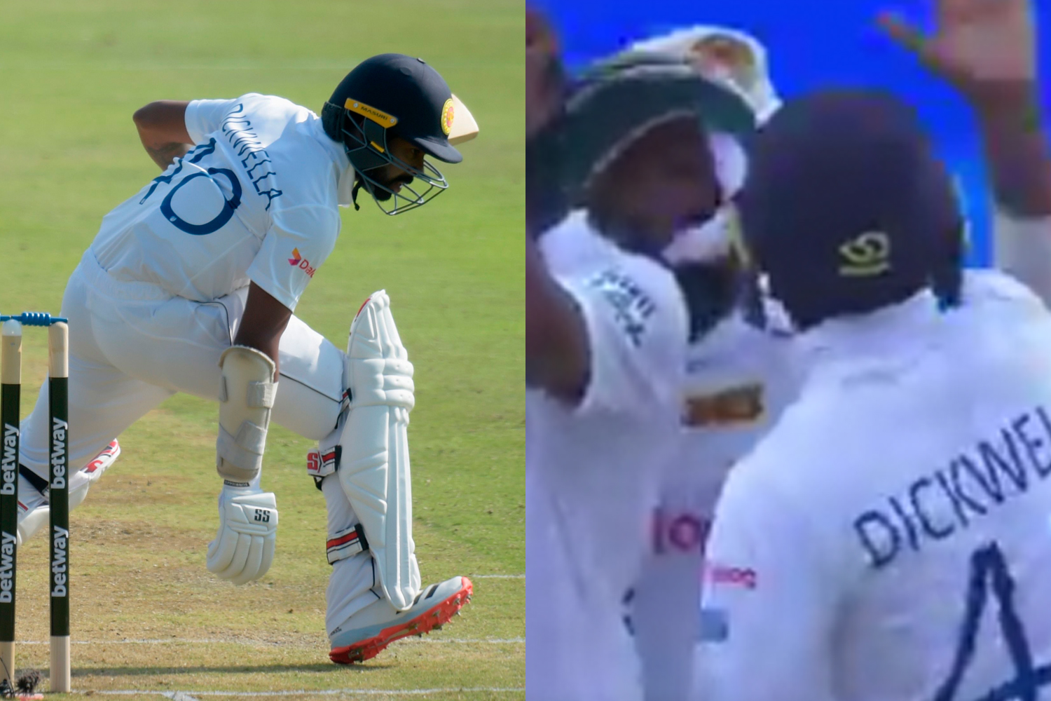 Understandably elated at getting the England skipper out, especially after his stunning score of 228 during the first innings, Dickwella attempted a simple high-five with teammate Wanindu Hasaranga.